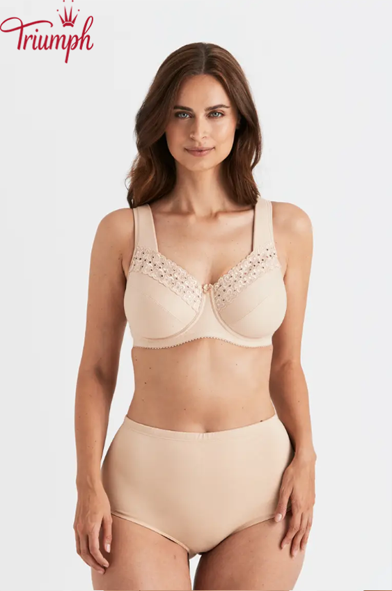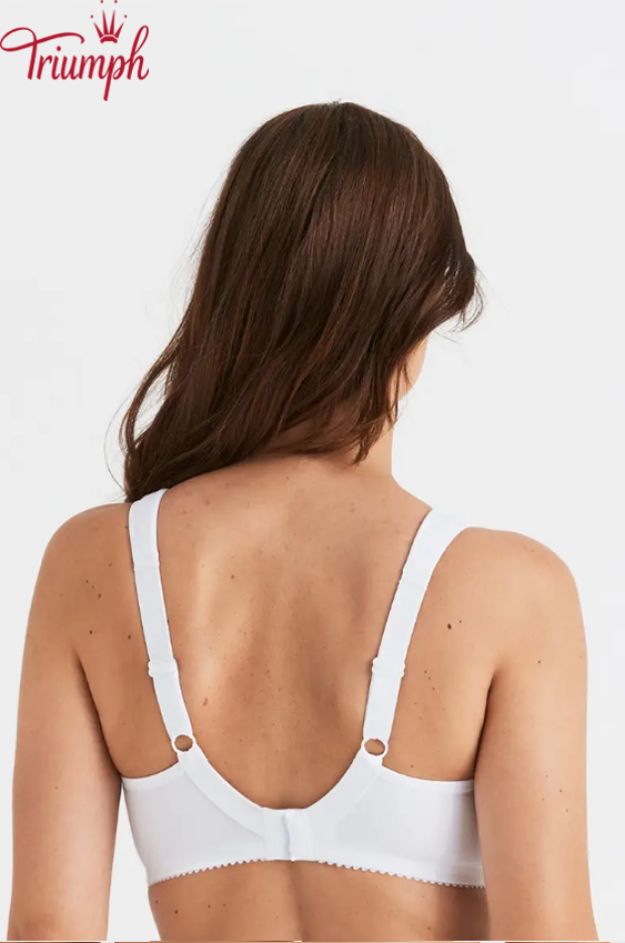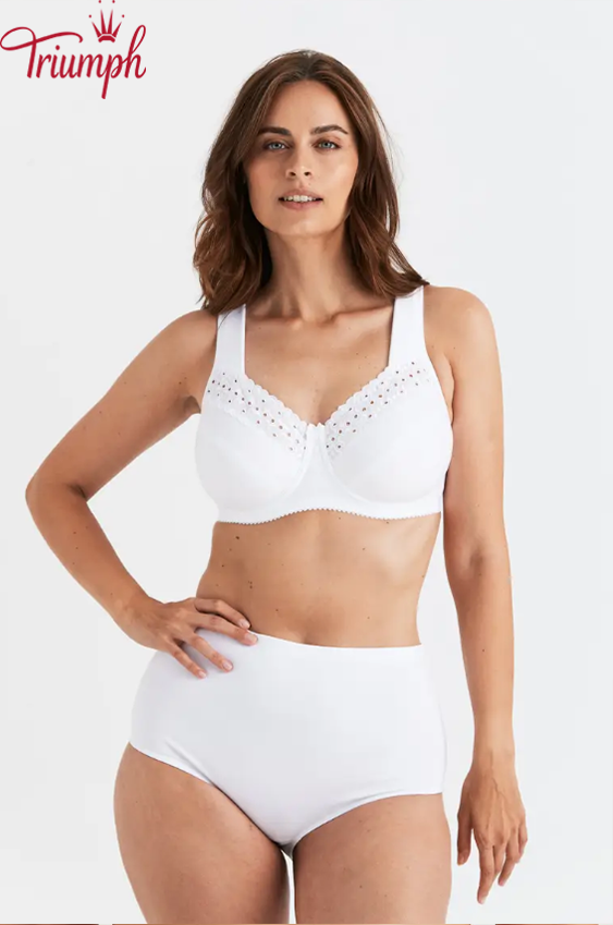 Неподплатен и неподплатен цял сутиен с кройка от две части, декориран с английска бродерия, естествено оформя бюста. Осигурява опора и повдигане до H чаша. Нашият мек памук е естествен материал, идеален за бельо, защото е издръжлив и лесен за поддръжка. Издържа много пранета, без да губи форма или качество. Широки, подплатени презрамки осигуряват дълготраен комфорт и облекчение. Еластичен гръб с регулируемо затваряне с кукичка и ухо.